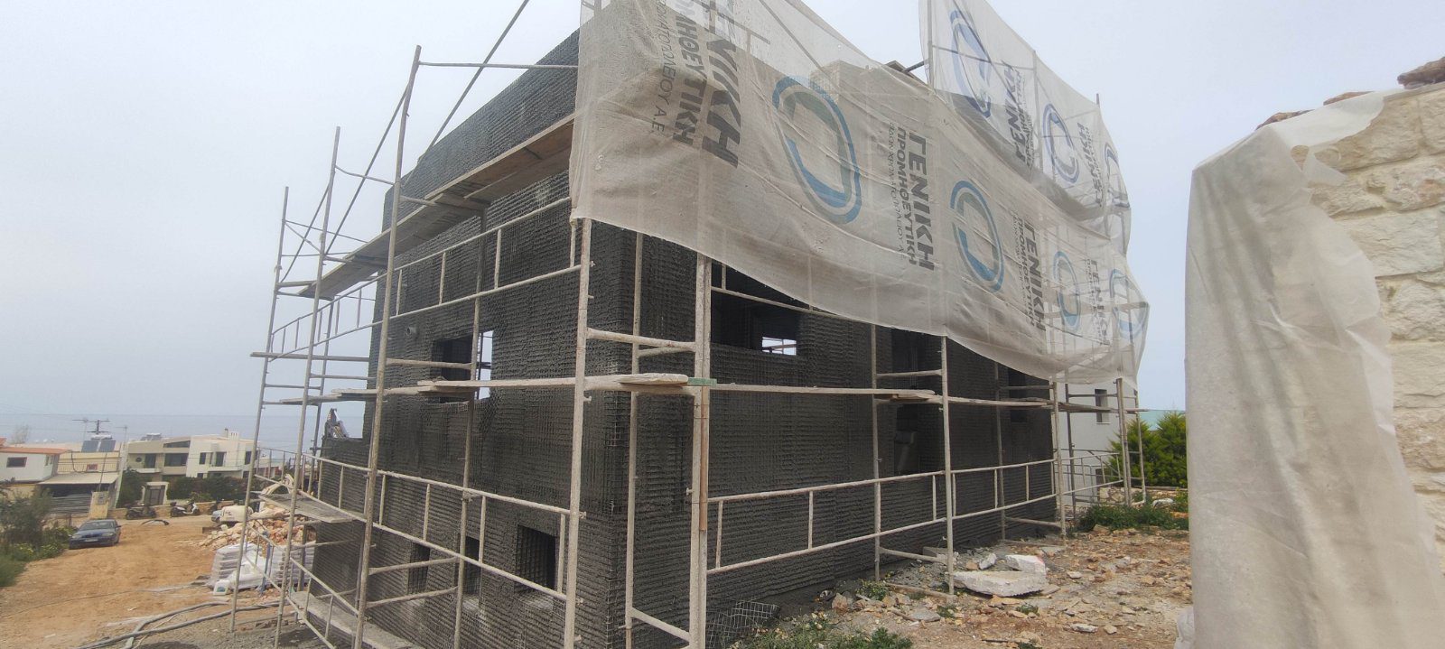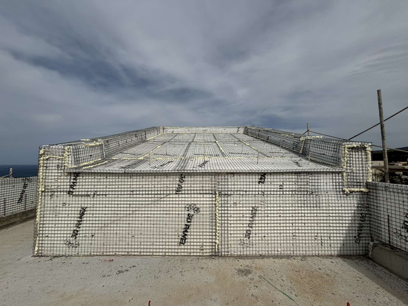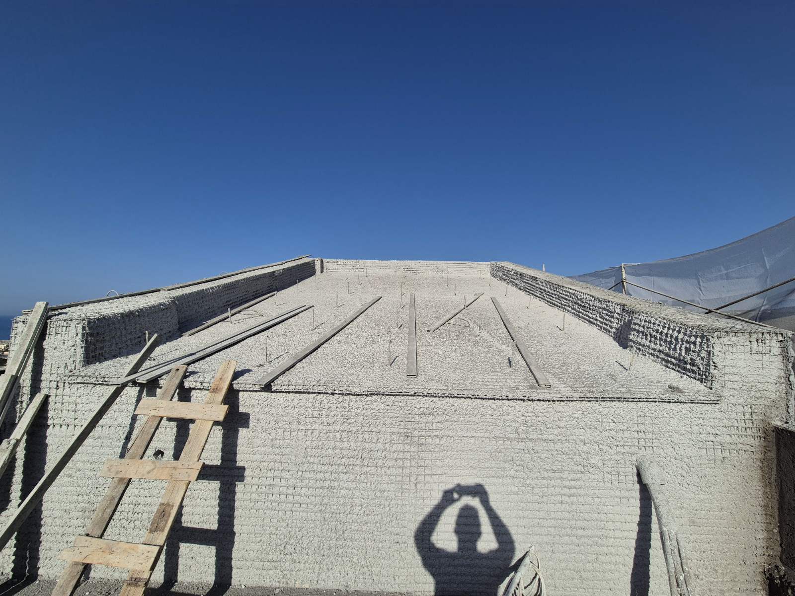 Ολοκλήρωση του συστήματος οπλισμένης τοιχοποιίας 3D Panel με την εκτόξευση ενισχυμένης τσιμεντοκονίας και τελικού επιχρίσματος.