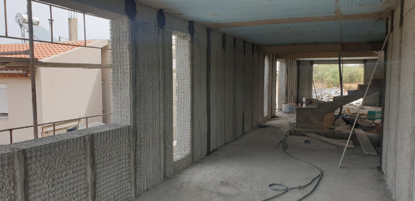 Ολοκλήρωση του συστήματος οπλισμένης τοιχοποιίας 3D Panel με την εκτόξευση ενισχυμένης τσιμεντοκονίας και τελικού επιχρίσματος.