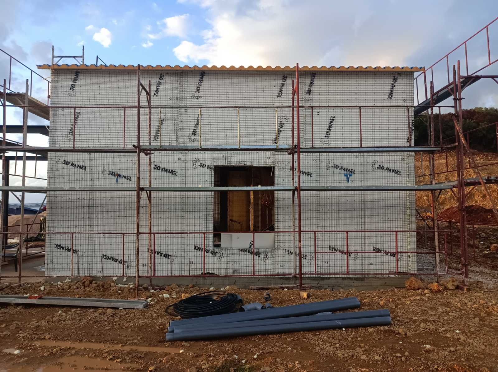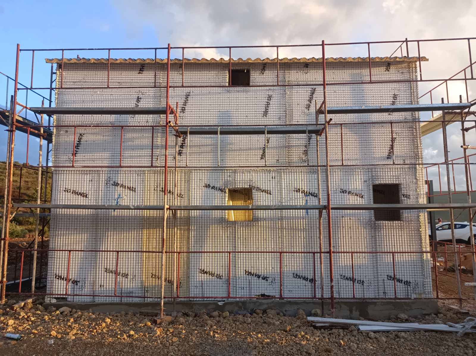 Ολοκλήρωση του συστήματος οπλισμένης τοιχοποιίας 3D Panel με την εκτόξευση ενισχυμένης τσιμεντοκονίας και τελικού επιχρίσματος.