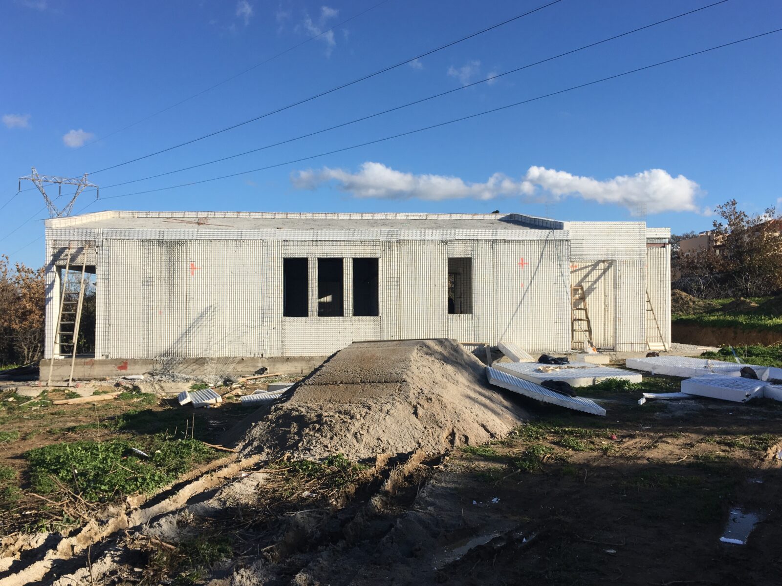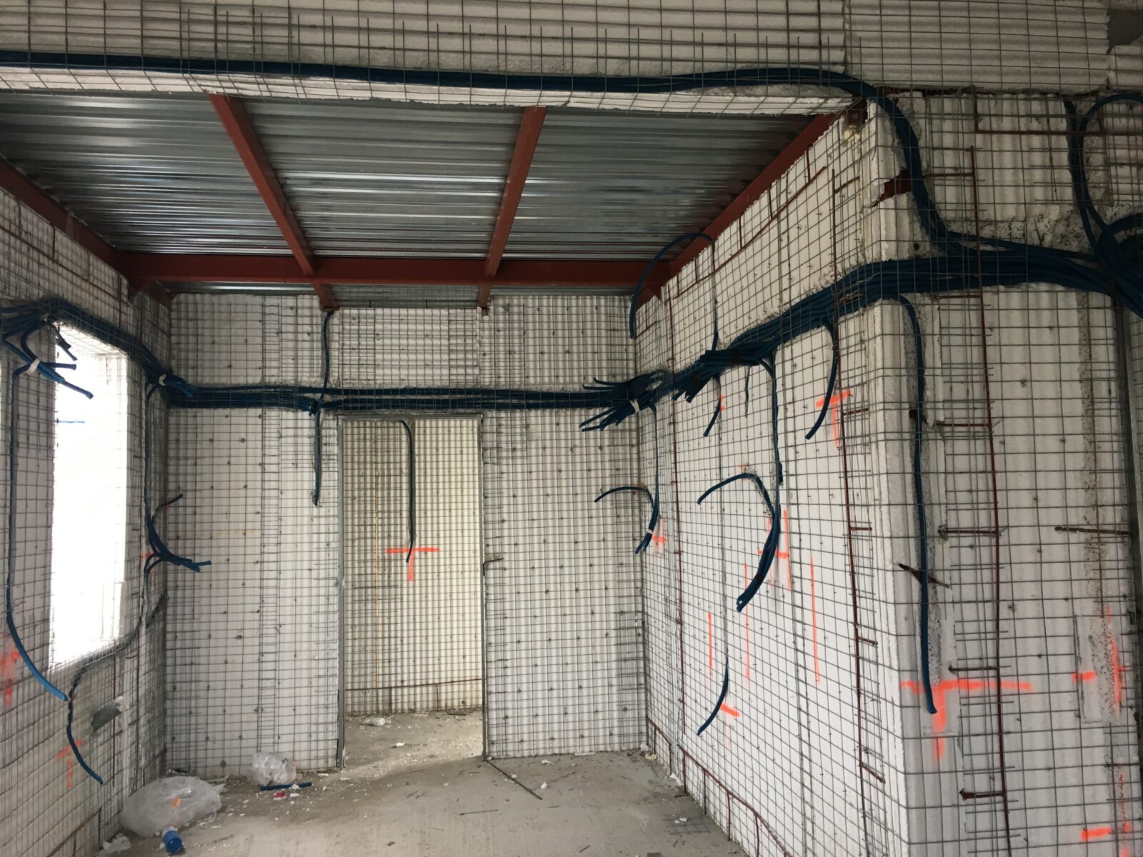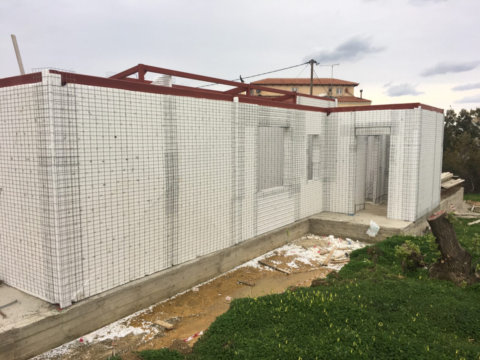 Ολοκλήρωση του συστήματος οπλισμένης τοιχοποιίας 3D Panel με την εκτόξευση ενισχυμένης τσιμεντοκονίας και τελικού επιχρίσματος.