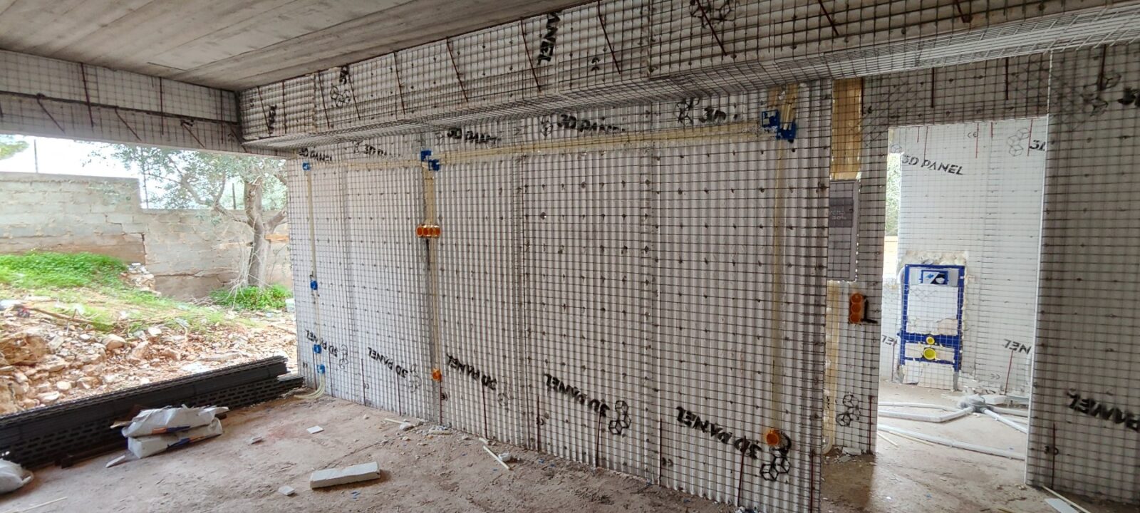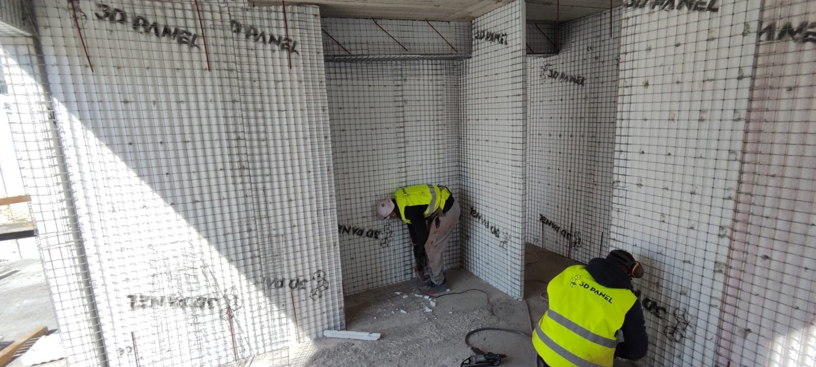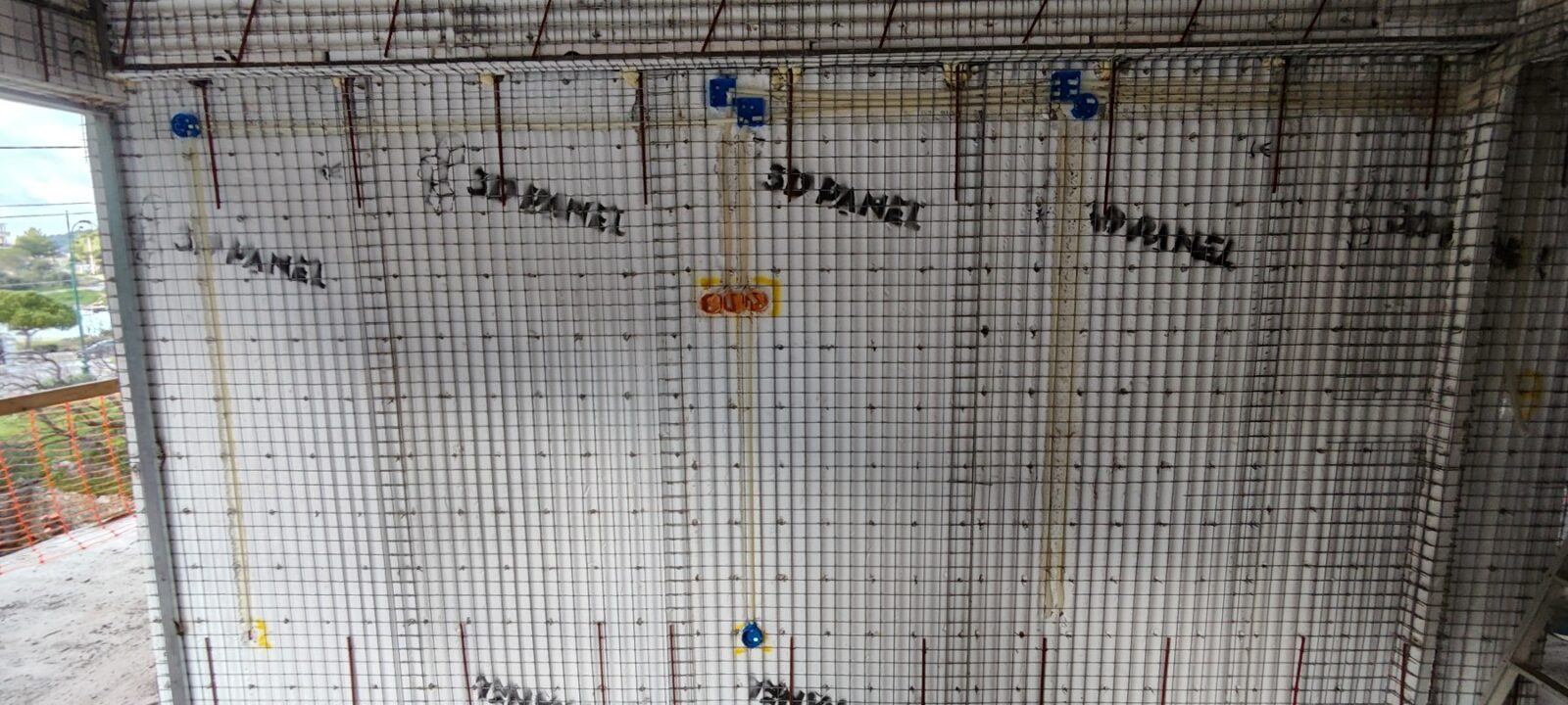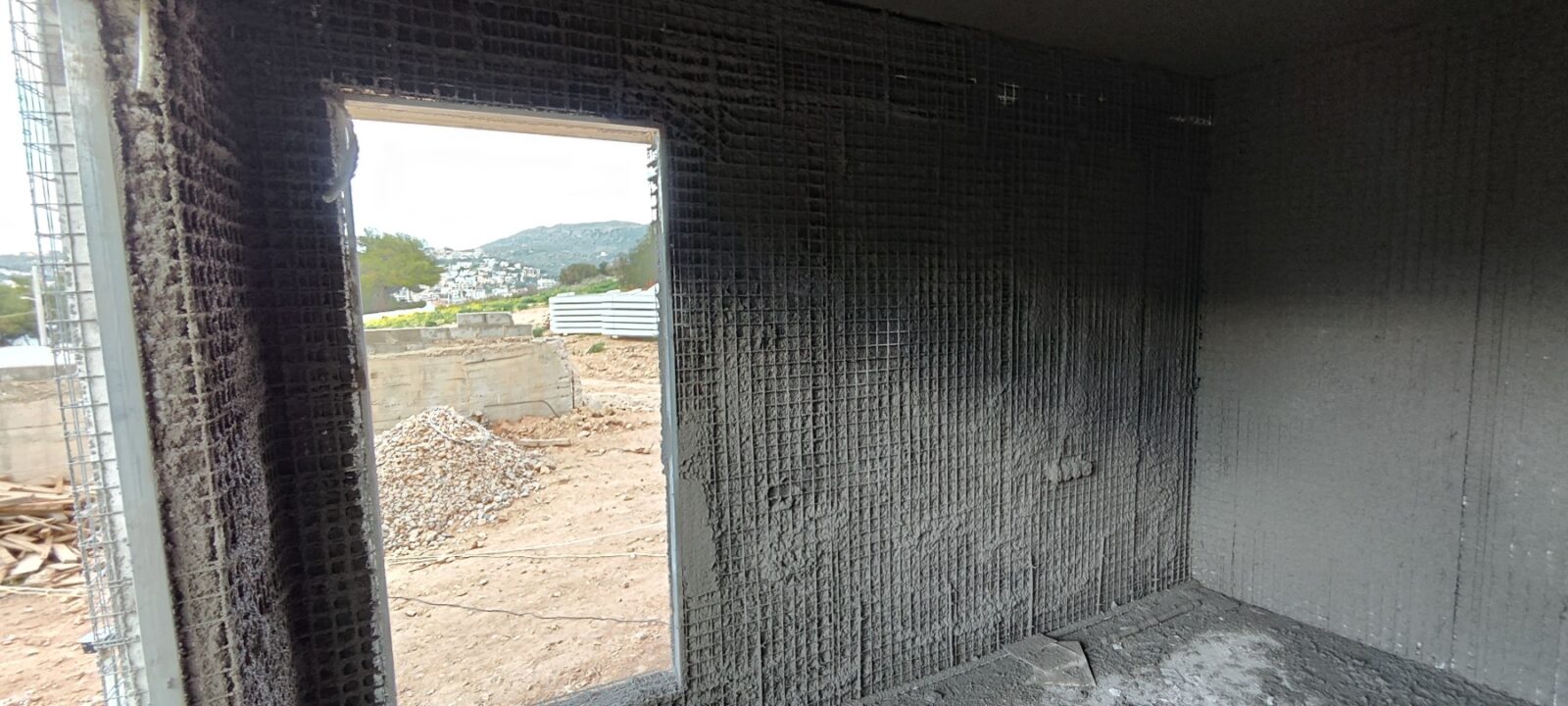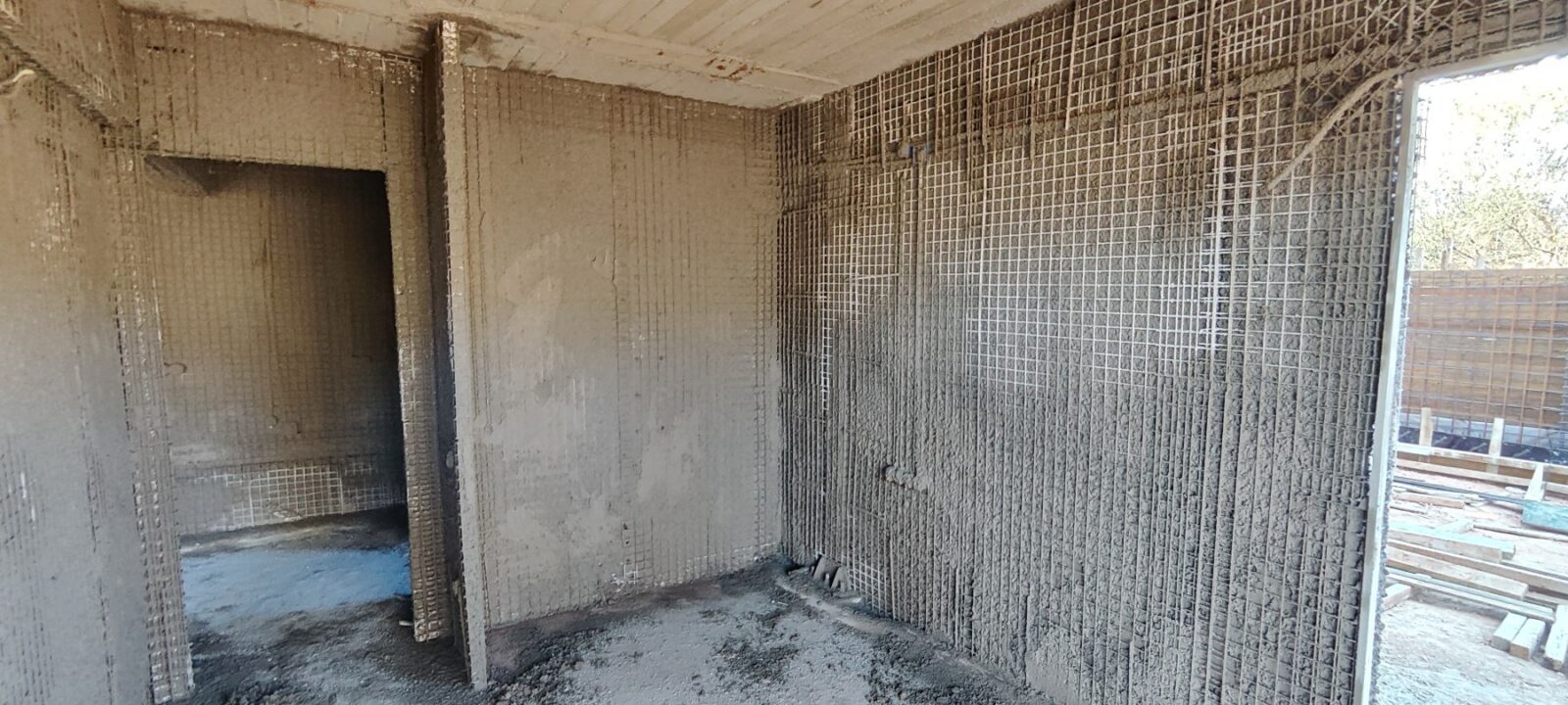 Ολοκλήρωση του συστήματος οπλισμένης τοιχοποιίας 3D Panel με την εκτόξευση ενισχυμένης τσιμεντοκονίας και τελικού επιχρίσματος.