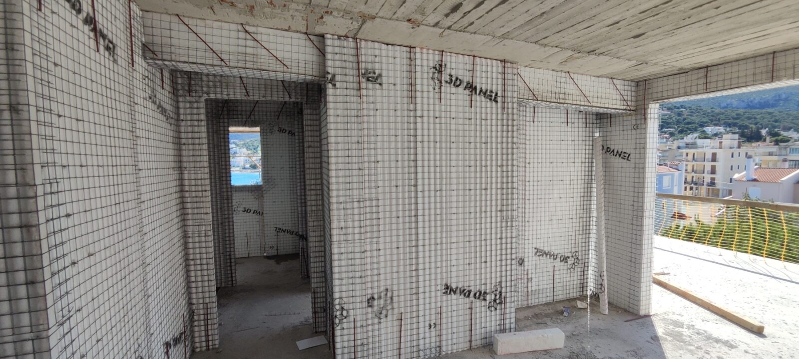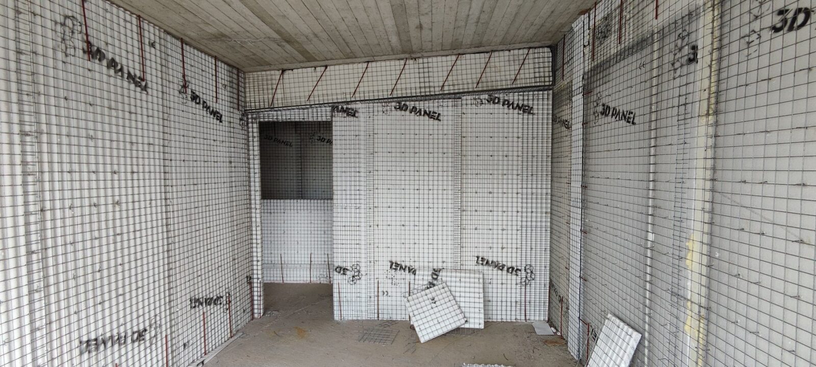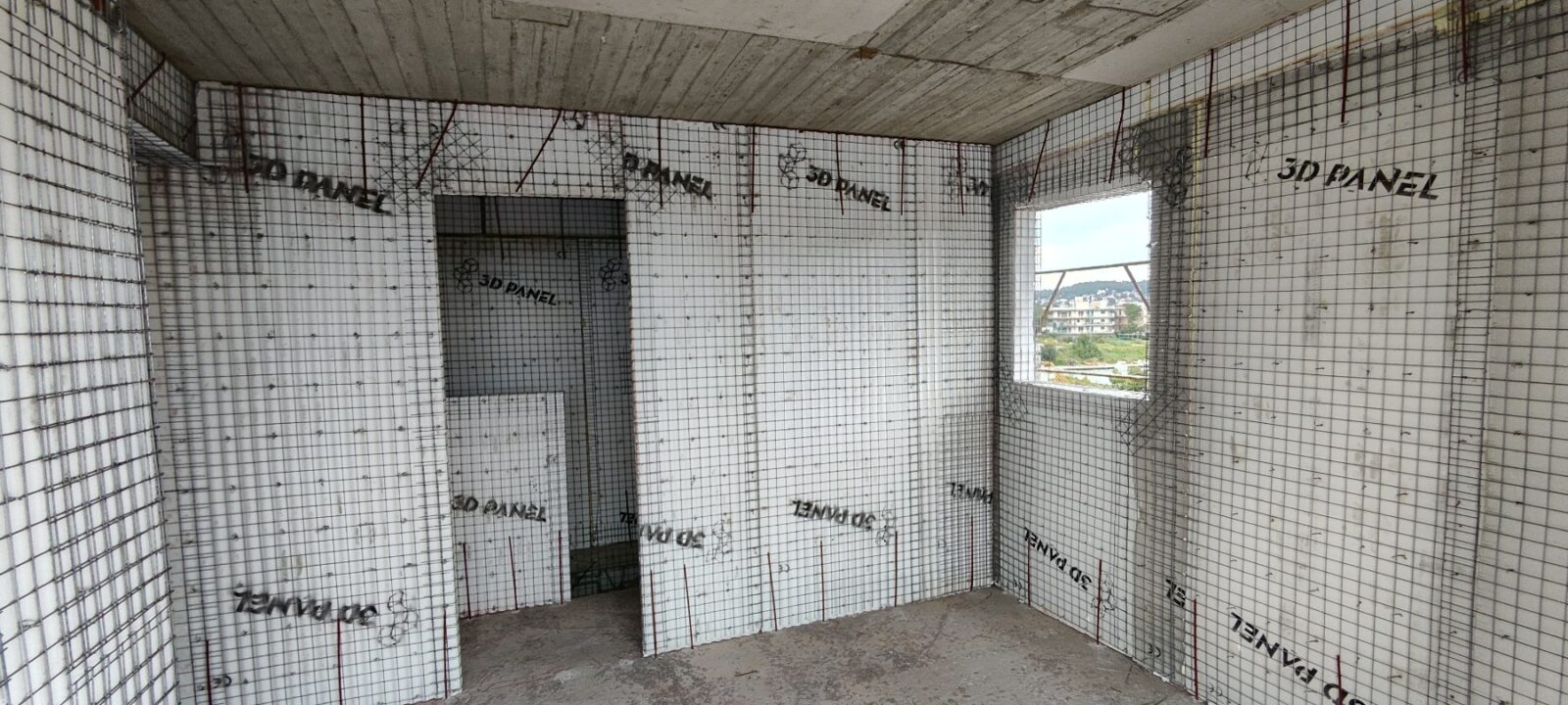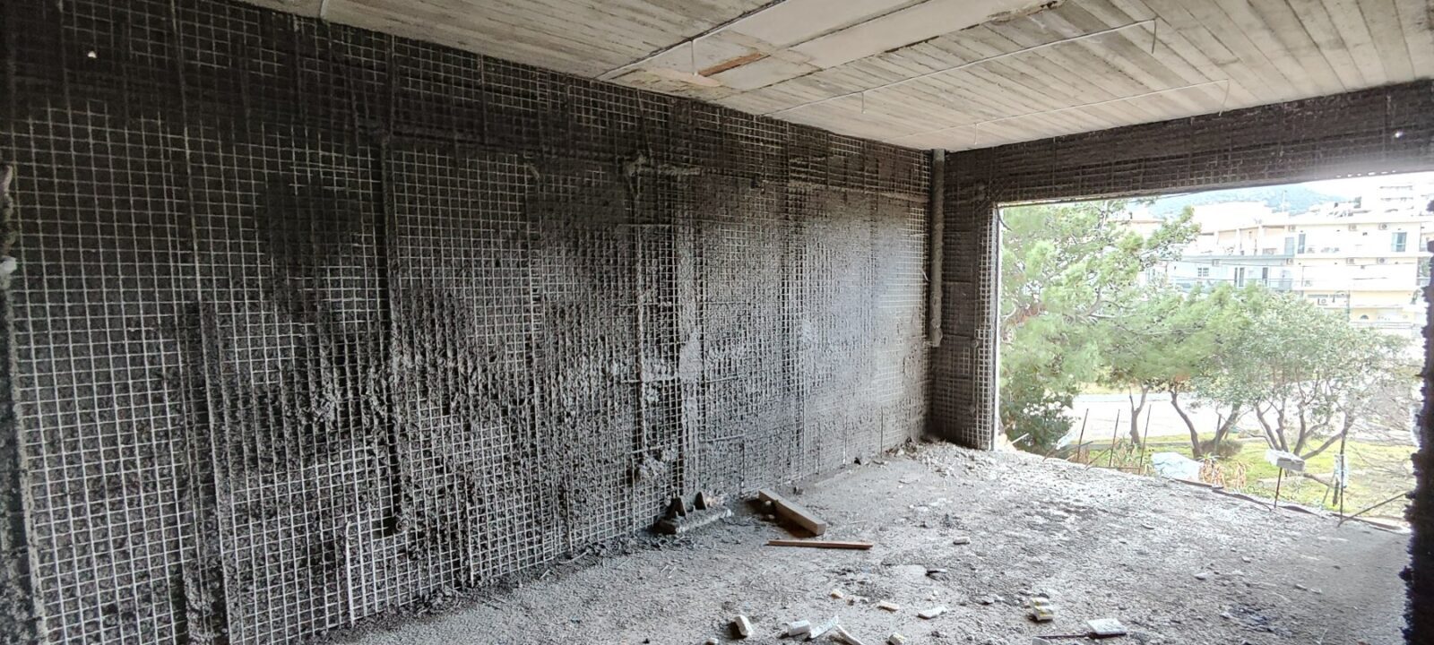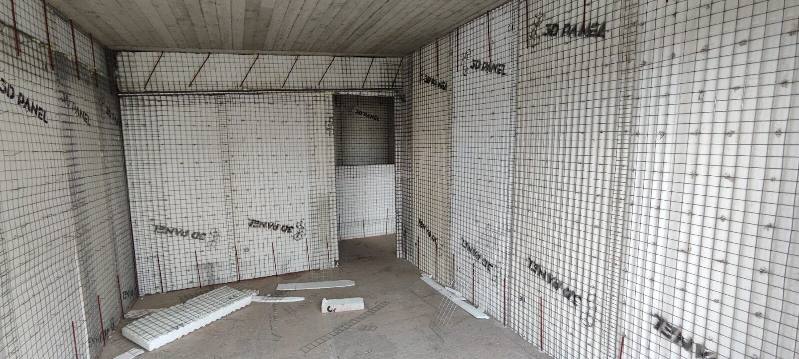 Ολοκλήρωση του συστήματος οπλισμένης τοιχοποιίας 3D Panel με την εκτόξευση ενισχυμένης τσιμεντοκονίας και τελικού επιχρίσματος.