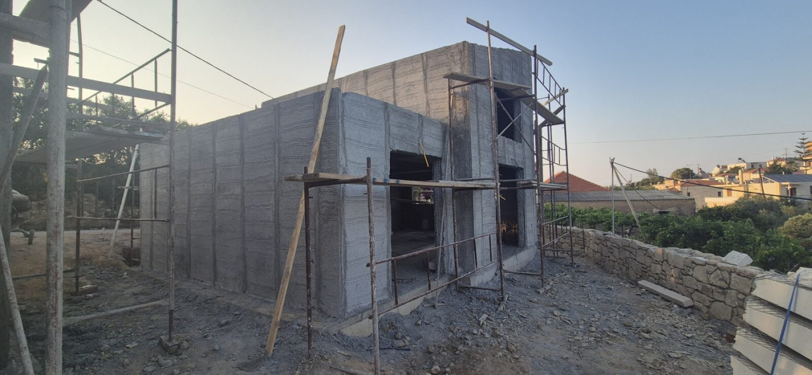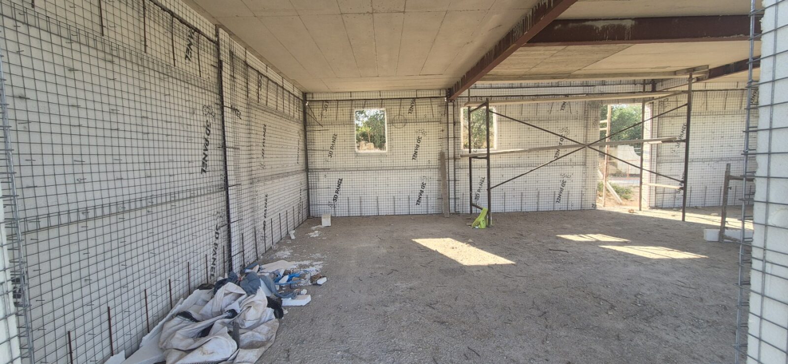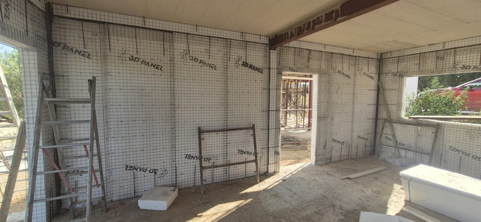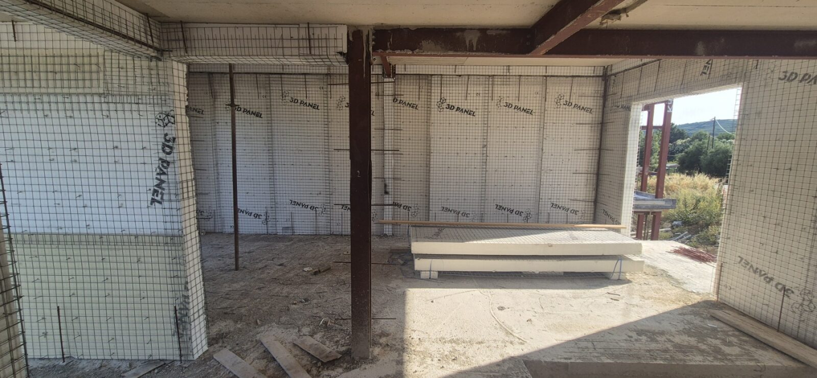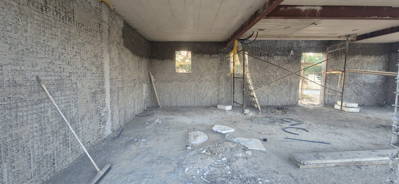 Ολοκλήρωση του συστήματος οπλισμένης τοιχοποιίας 3D Panel με την εκτόξευση ενισχυμένης τσιμεντοκονίας και τελικού επιχρίσματος.