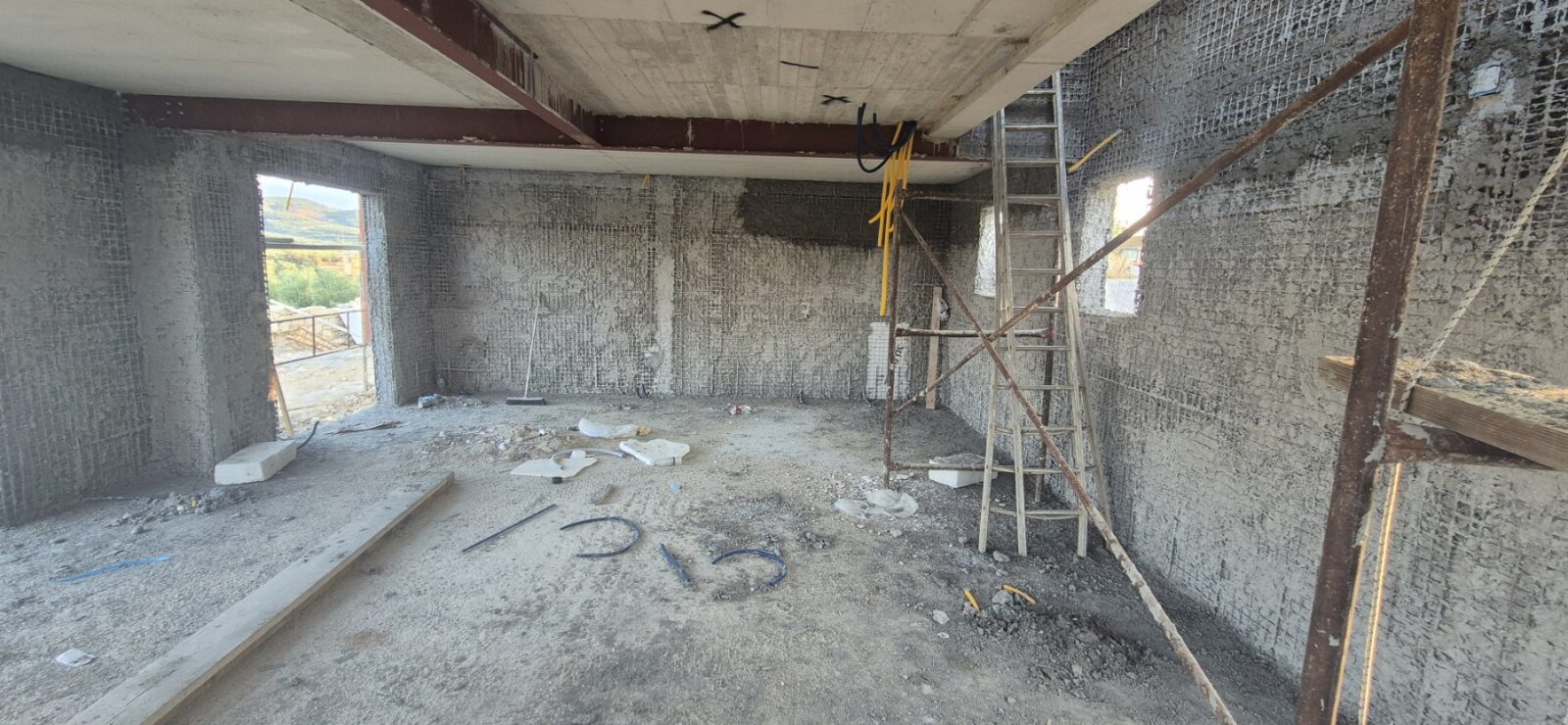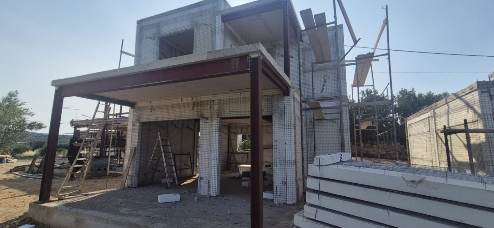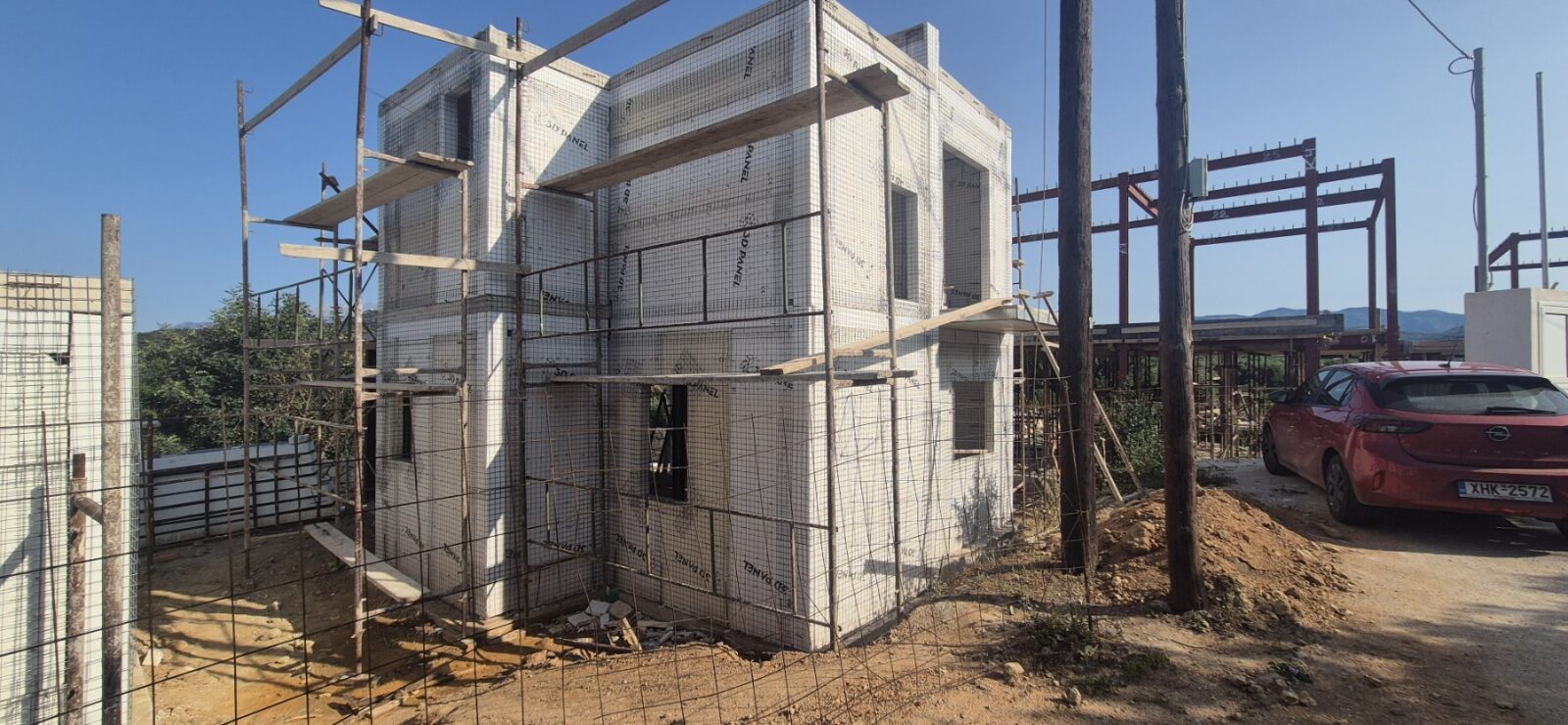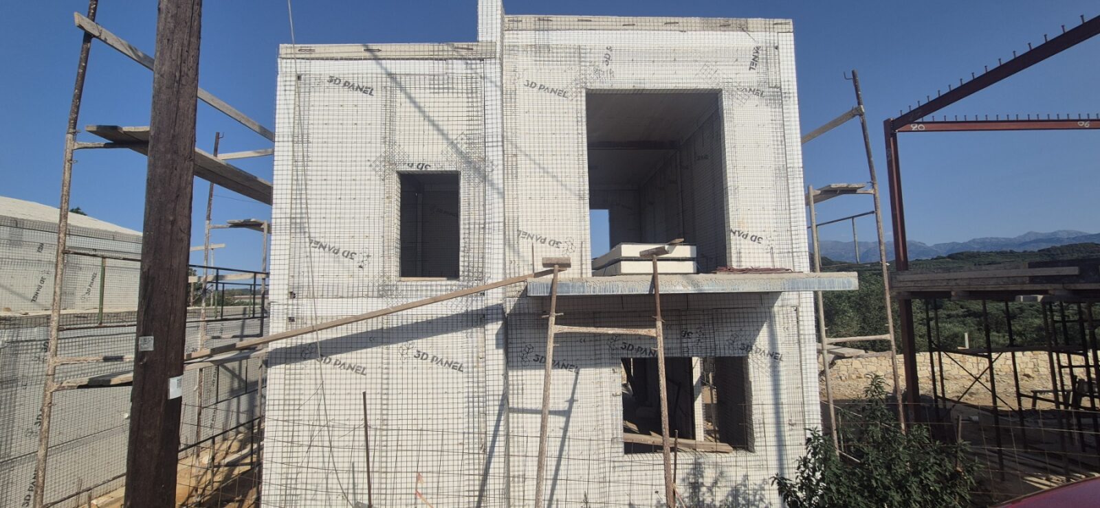 Ολοκλήρωση του συστήματος οπλισμένης τοιχοποιίας 3D Panel με την εκτόξευση ενισχυμένης τσιμεντοκονίας και τελικού επιχρίσματος.