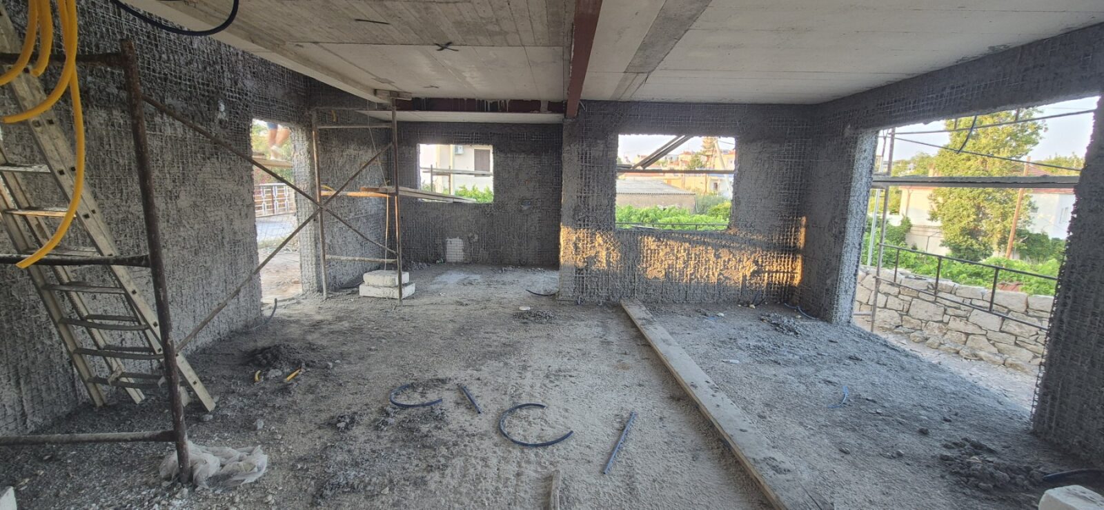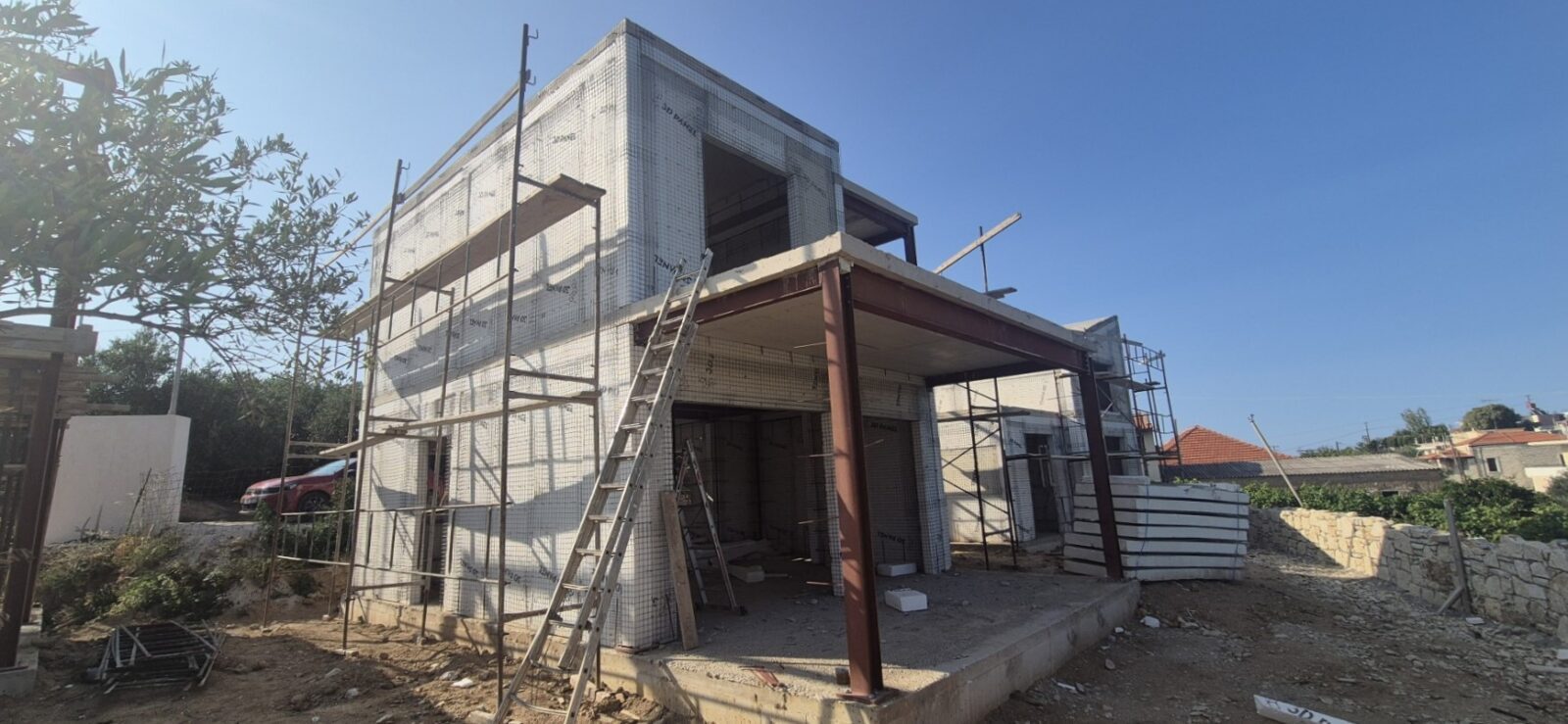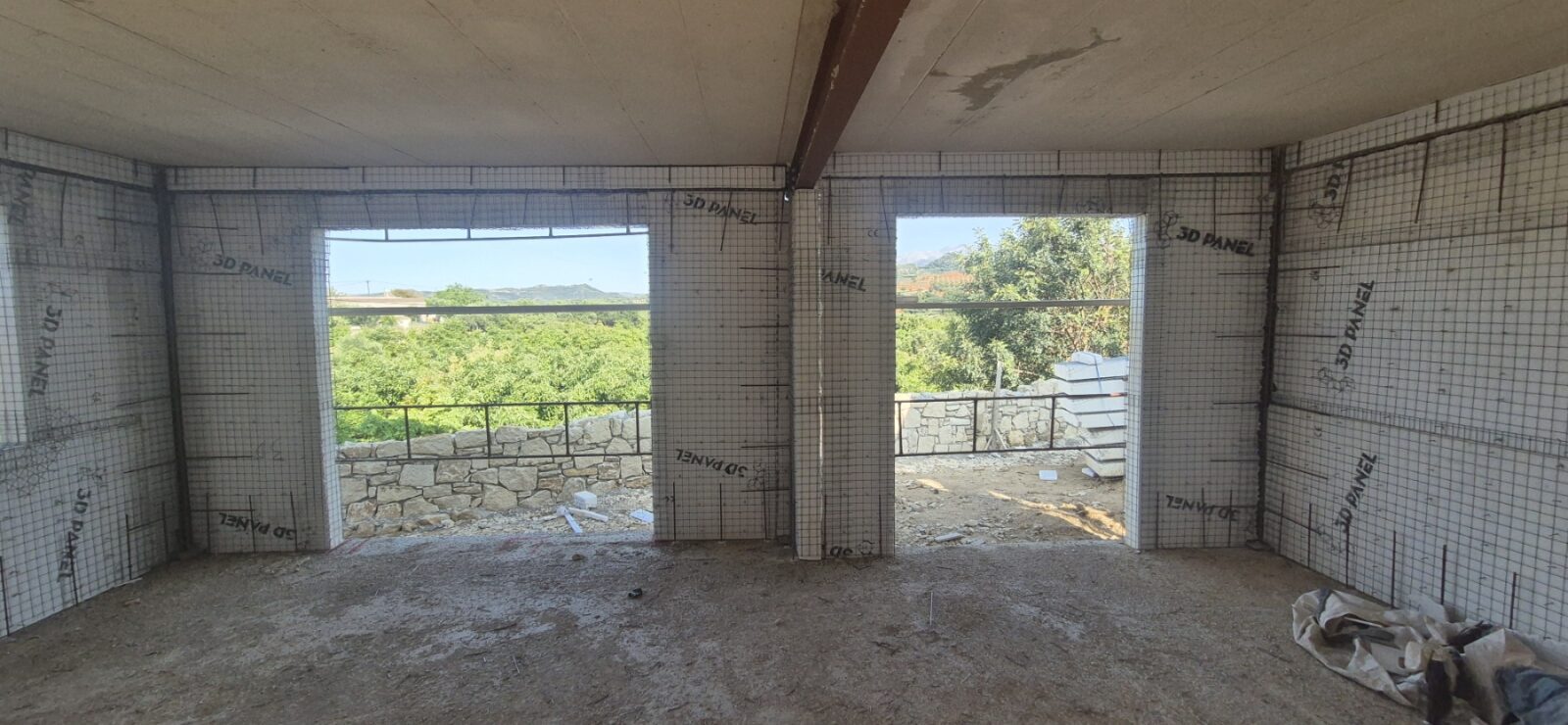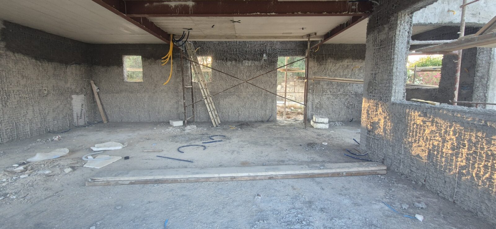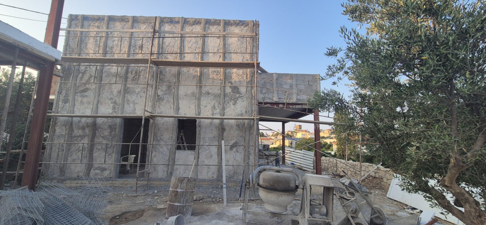 Ολοκλήρωση του συστήματος οπλισμένης τοιχοποιίας 3D Panel με την εκτόξευση ενισχυμένης τσιμεντοκονίας και τελικού επιχρίσματος.